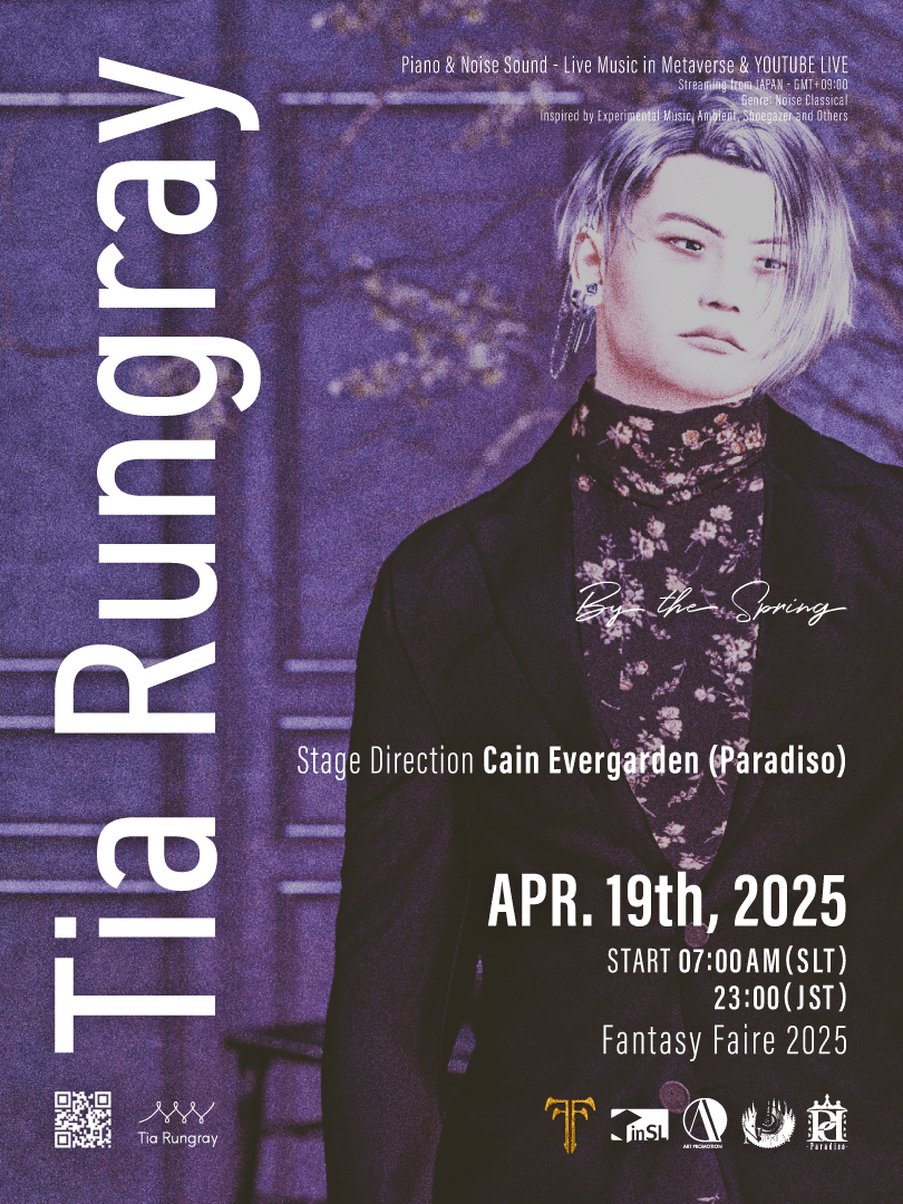 At Fantasy Faire 2025, one of the largest fantasy events in Second Life, Tia Rungray will hold a special performance themed “By the Spring.” The melodies of the piano resonating over the clear water and the waves of noise rising from the depths will create a world of fantasy. The stage direction will be handled by Cain Evergarden, the owner of “Paradiso” and “CLUB Beatrice,” who has also directed SL20B Music Fest and past Fantasy Faire performances. Don’t miss this special moment where sound and space intertwine.