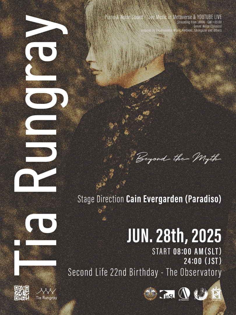 At the Second Life 22nd Birthday event “SL22B,” Tia Rungray will present a special performance. The resonance of piano melodies and the waves of noise emerging from the void will create a dreamlike space that drifts along the outer shell of emptiness. Stage direction will be handled by Cain Evergarden, owner of “Paradiso” and “CLUB Beatrice,” who has also directed SL20B Music Fest and past Fantasy Faire performances. Don’t miss this singular moment where sound and space converge.